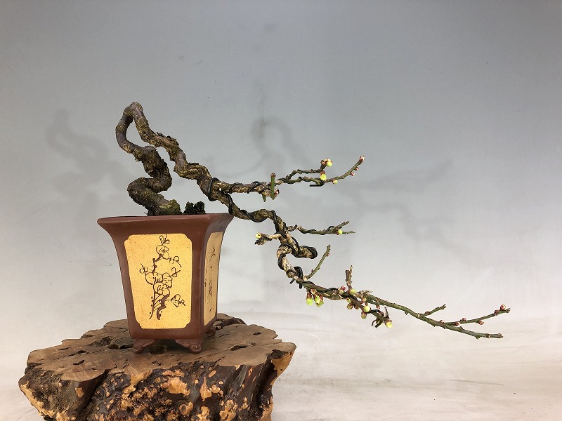 ▽甲州野梅では珍しい懸崖樹形、挿し木で仕上げた木ですお勧めの盆栽です。