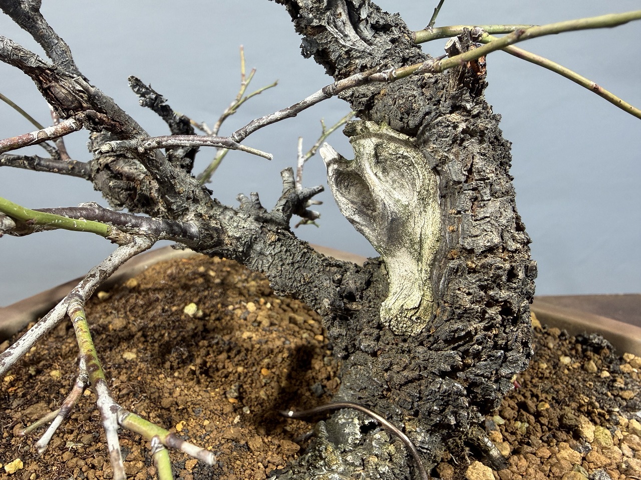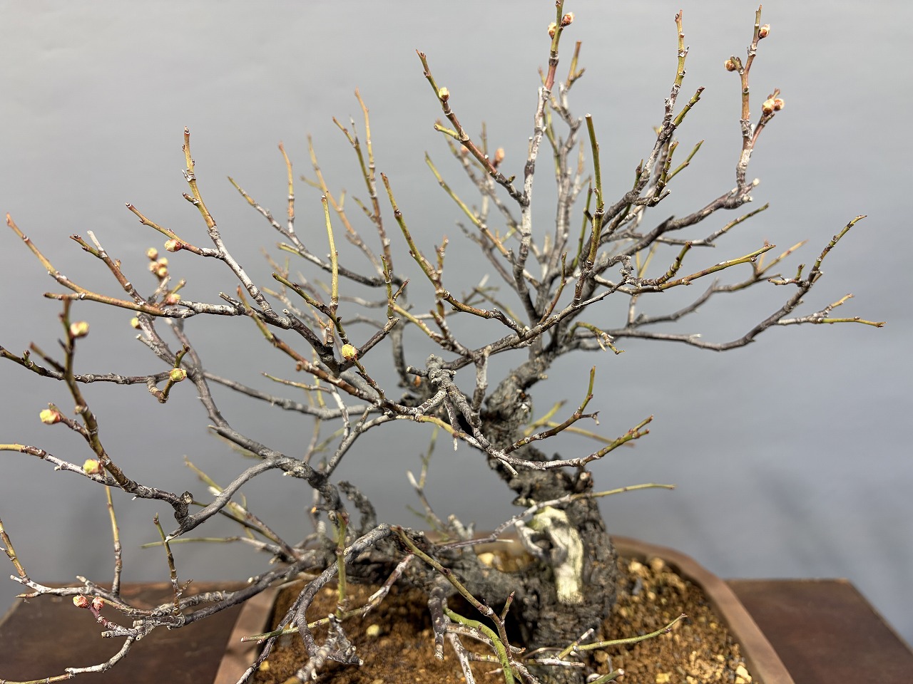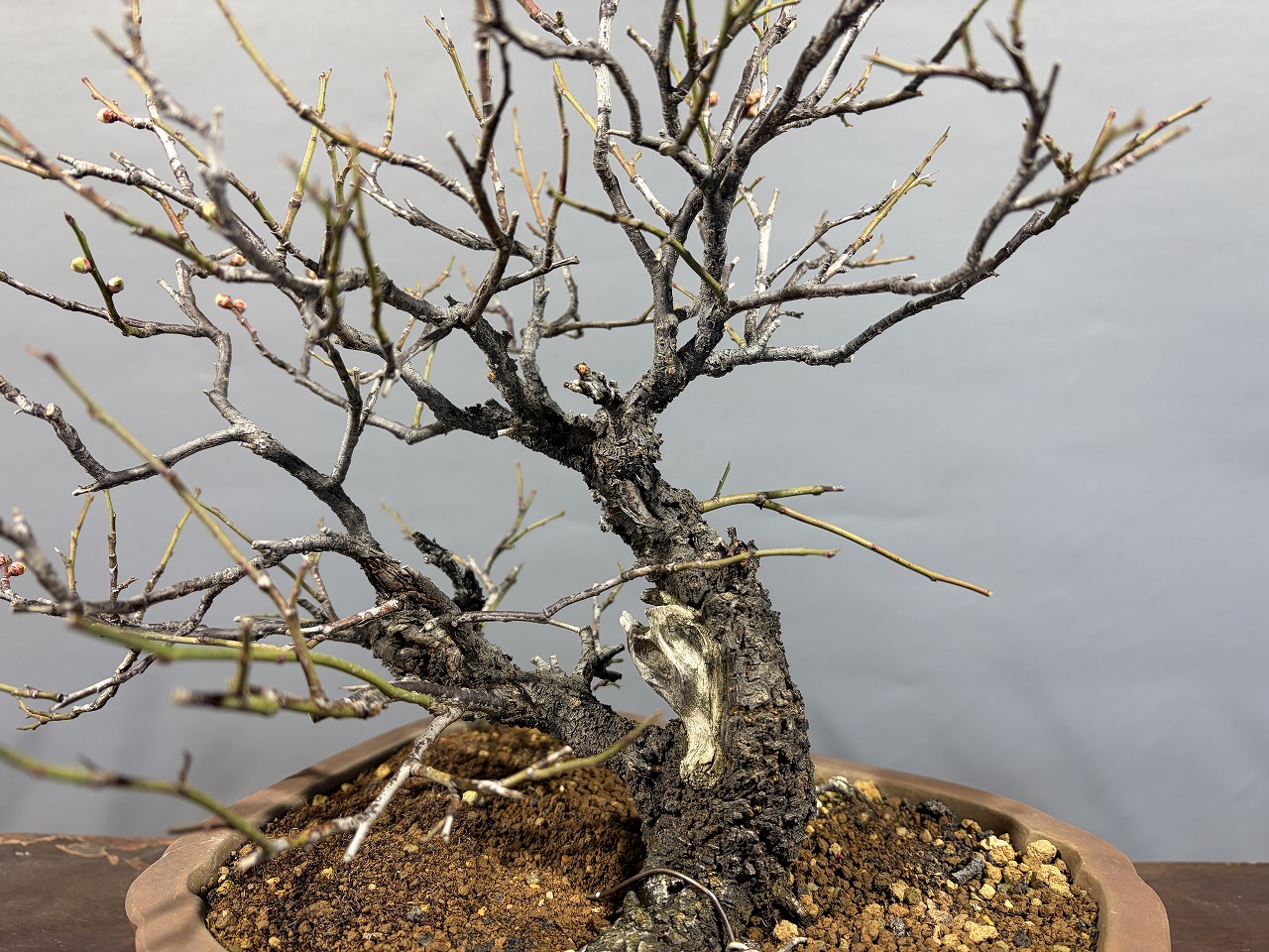 ※甲州野梅らしい肌荒れに細枝、今年から花芽を付けました。